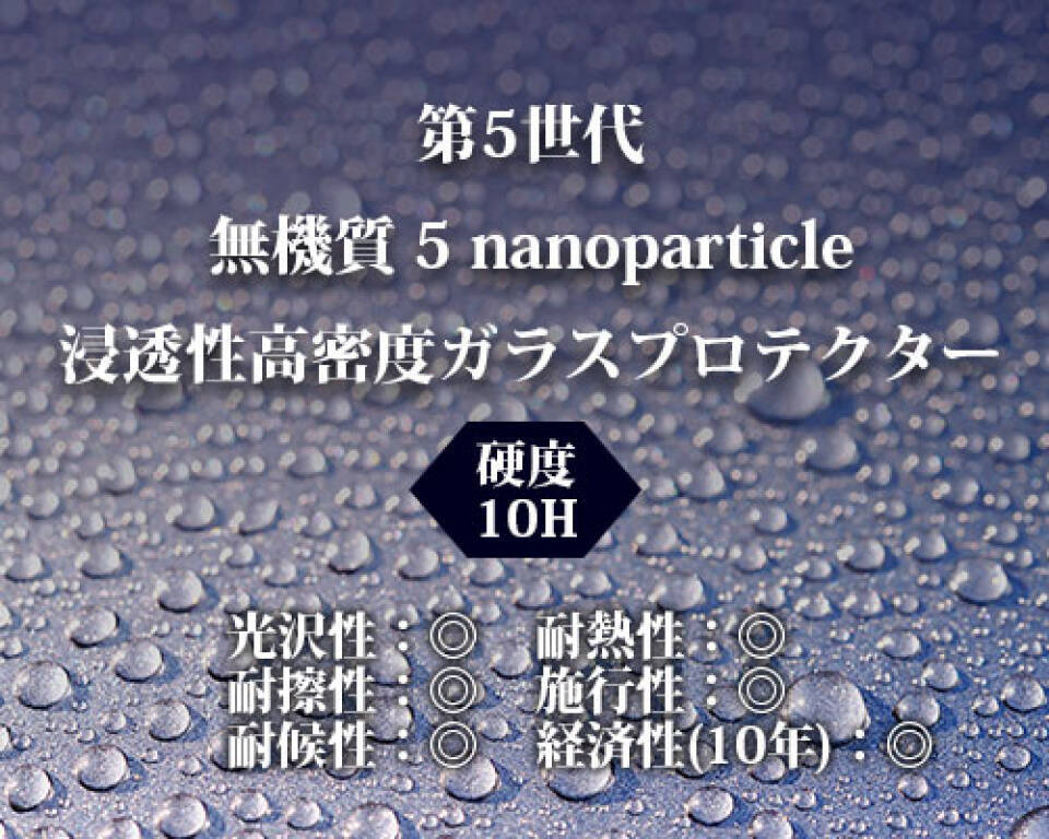 ガラスコーティング剤として求められる「耐久性・防汚性・施工性・光沢美観・メンテナンス性」を追求し、原料・製造の技術革新や改良を重ね、比類ない第5世代として、日本初上陸。
